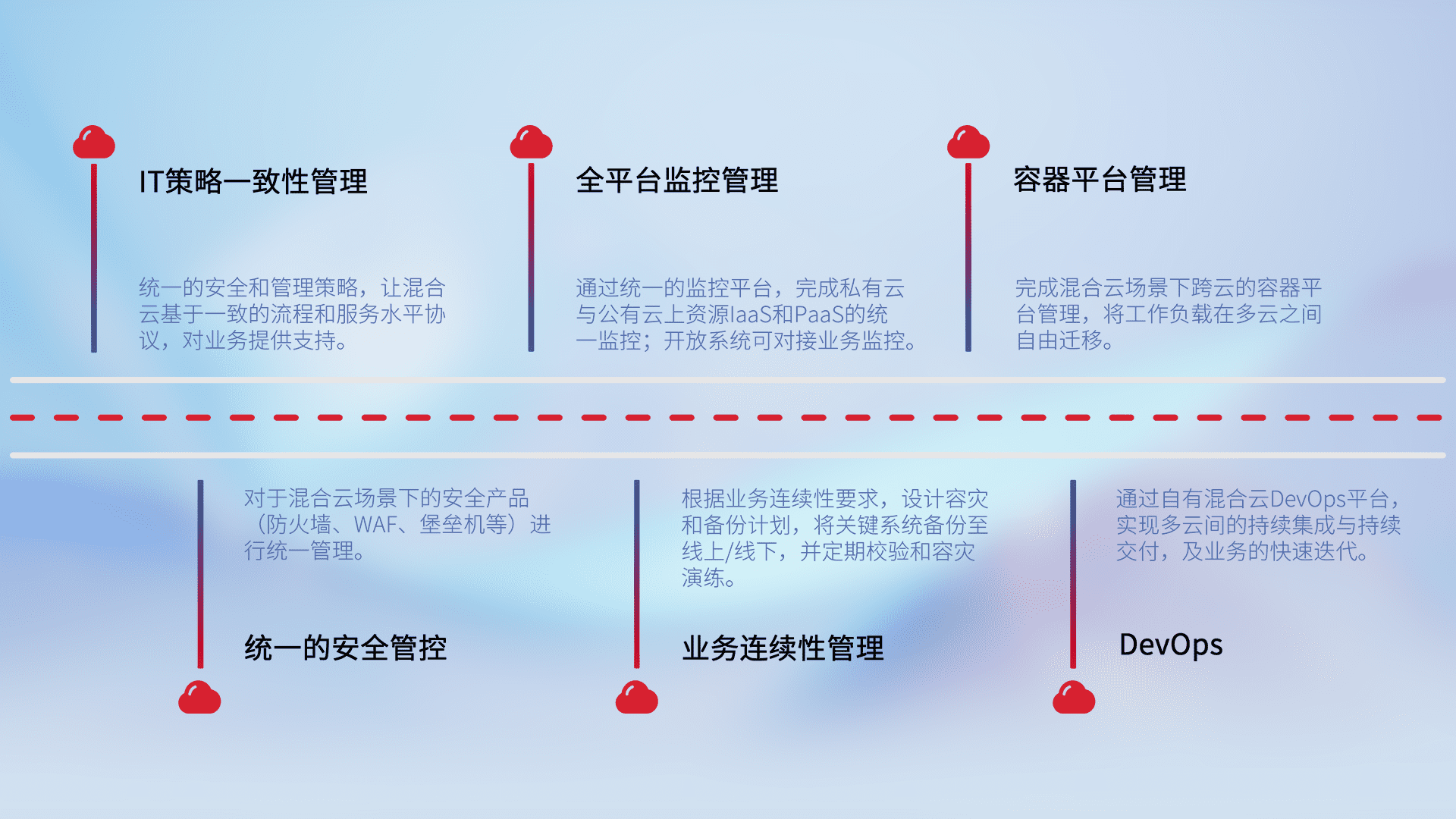 通过多云纳管,,以统一的资源数据模型把客户的云资源进行抽象和封装,,,进而实现对多云资源的统一操作,,保障云资源管理的可靠性、、稳定性与可用性。。。。量身定制化运维内容,,配置、、开发运维、、、、补丁管理、、、备份、、监控、、、认证和访问管理、、、、审计和日常巡检等,,保障在用云过程中的可靠度,,,稳定度以及高可用率。。